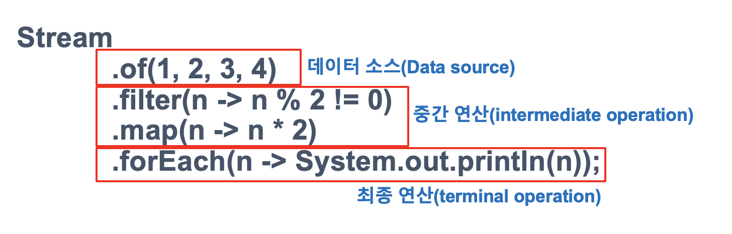 컬렉션 또는 배열에서 스트림을 생성하고, 중간 연산을 거친 뒤 최종 연산에 도달할 수 있다.