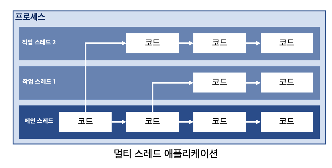이를 해석하면, 멀티 스레드 프로세스는 프로그램 또는 어플리케이션이 동시 작업을 할 수 있다는 것이다. 즉, 여러 코드를 각 스레드에 분배하여 동시에 실행시키는 것이다.