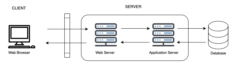 웹 브라우저를 통해 클라이언트의 요청에 따라 웹 서버에 도달하게 되고, 애플리케이션 서버와 데이터베이스를 거쳐 필요한 리소스를 받아 클라이언트로 응답한다. 이때 클라이언트는 결과를 화면에 표시하게 된다.