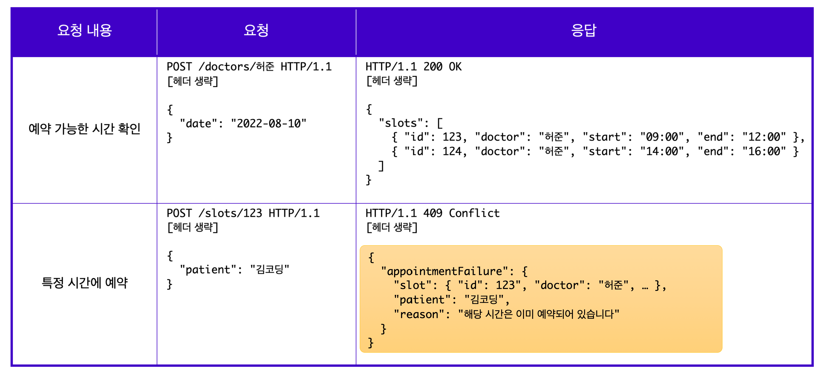 응답으로 리소스를 전할 때에도 리소스에 대한 정보와 함께 리소스 사용에 대한 성공/실패 여주를 반환해야 한다. 예를 들어 환자가 허준 의사에게 9시 예약을 진행하였으나 해당 시간이 마감되어 예약이 불가능하다면, 다음과 같이 리소스 사용에 대한 실패 여부를 포함한 응답을 받아야 한다.