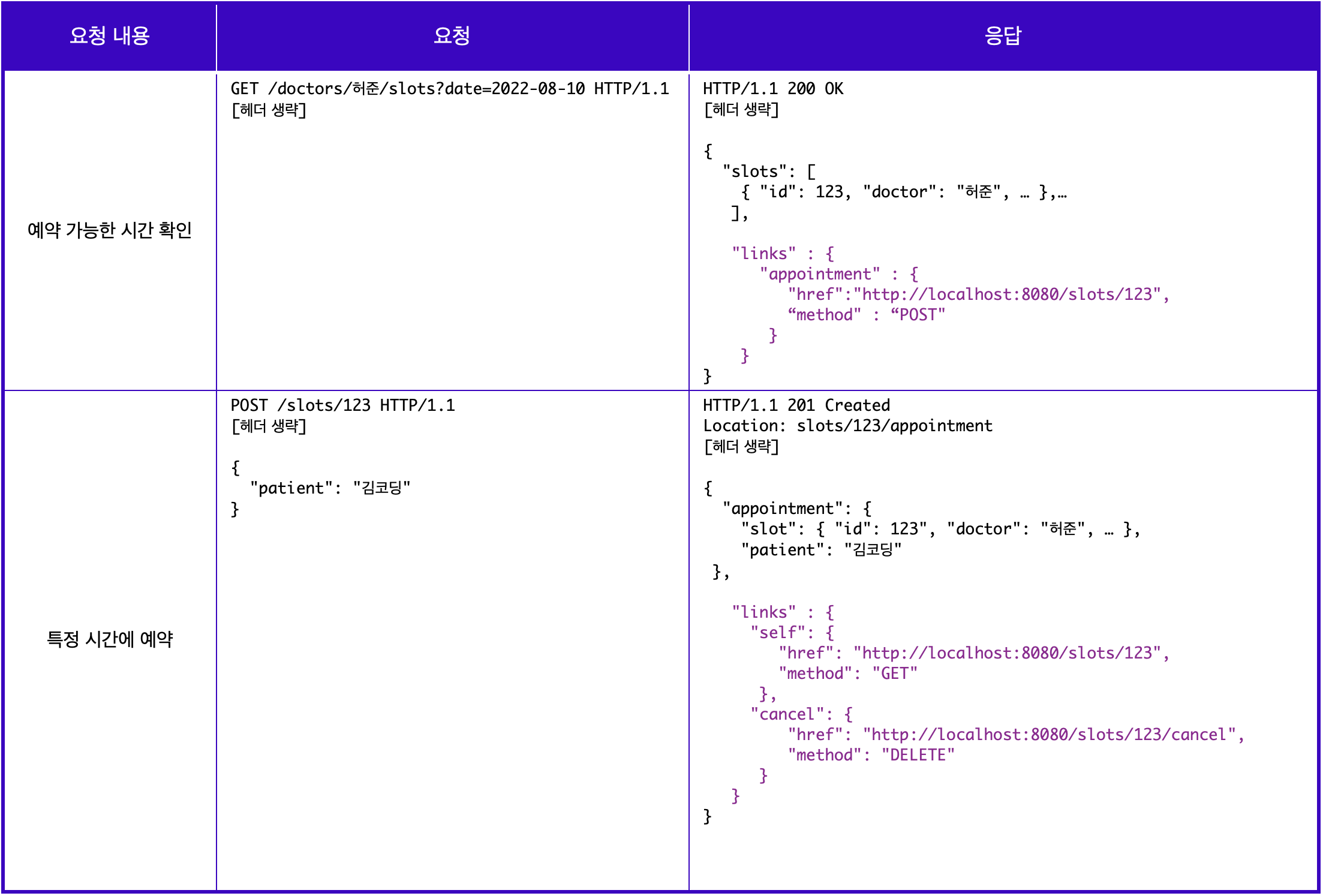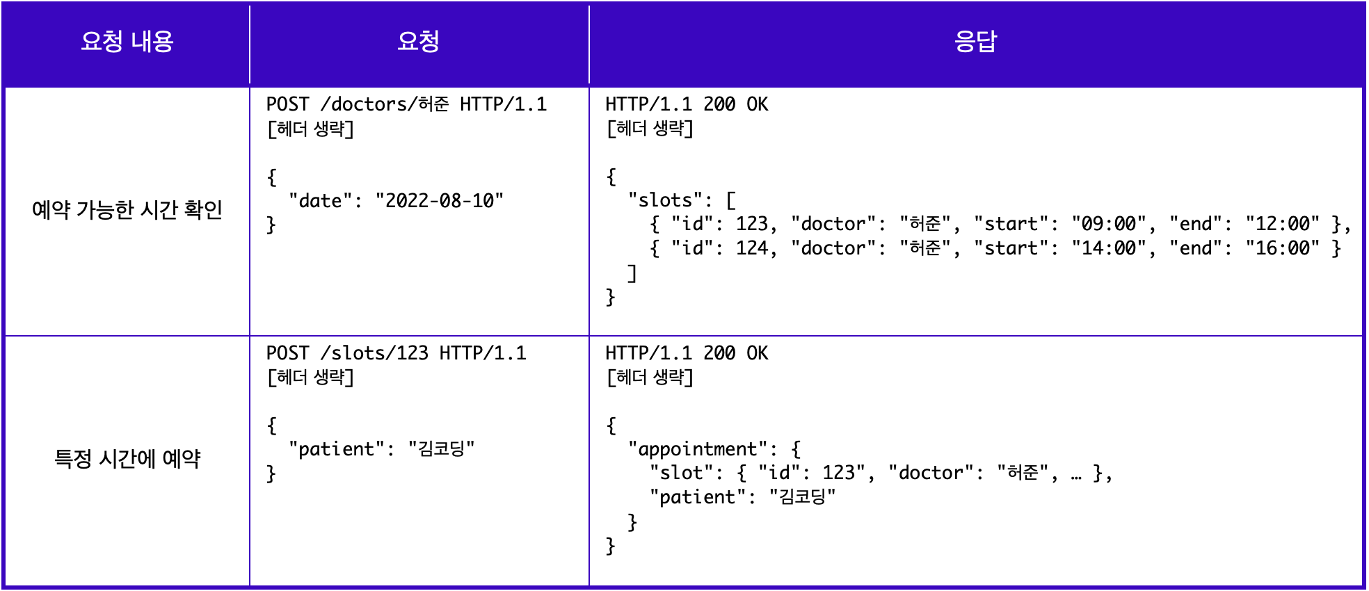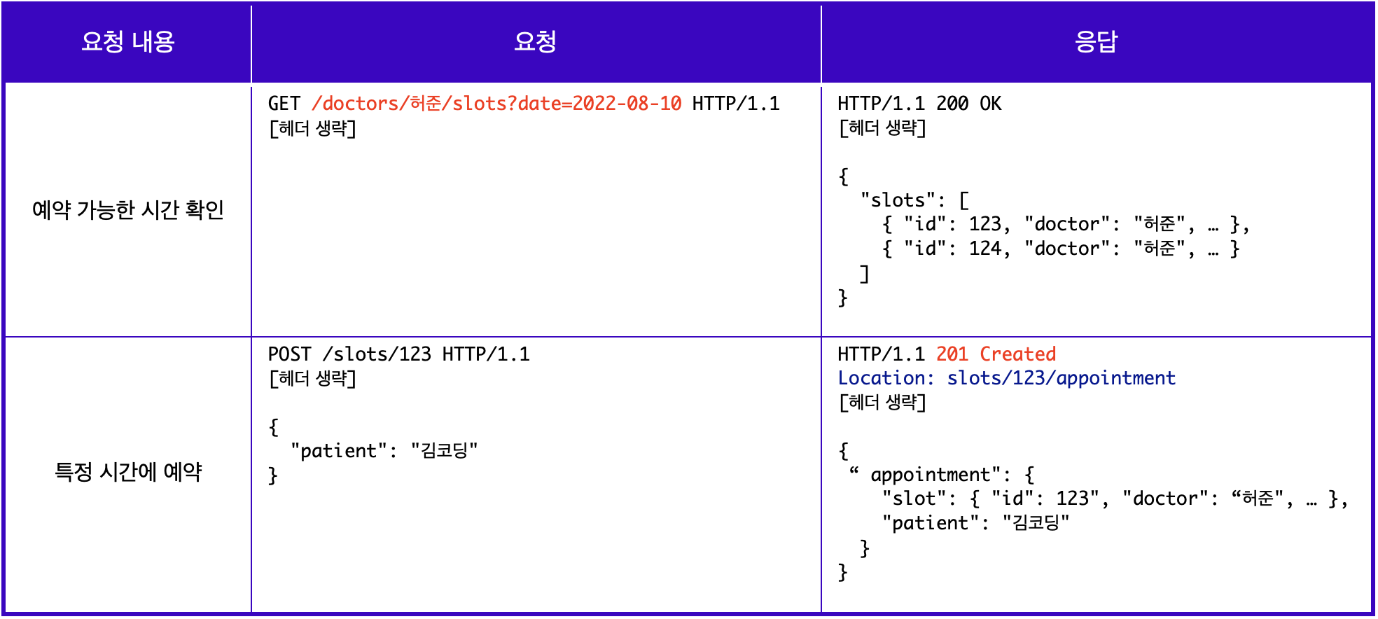 따라서 /doctor/허준이라는 엔드포인트를 사용한다. 뿐만 아니라 특정 시간에 예약을 하게 되면, 실제 slots라는 리소스의 123이라는 id를 가진 리소스가 변경되기 때문에, 하단의 특정 시간에 예약이라는 요청에서는 /slots/123으로 실제 변경되는 리소스를 엔트포인트로 사용한다.