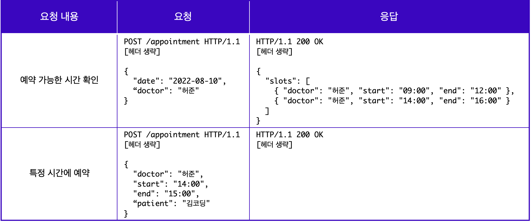앞서 0단계에서는 모든 요청을 엔드포인트로 /appointment를 사용한다. 하지만, 1단계에서는 요청하는 리소스가 무엇인지에 따라 각기 다른 엔드포인트로 구분하여 사용해야 한다.
