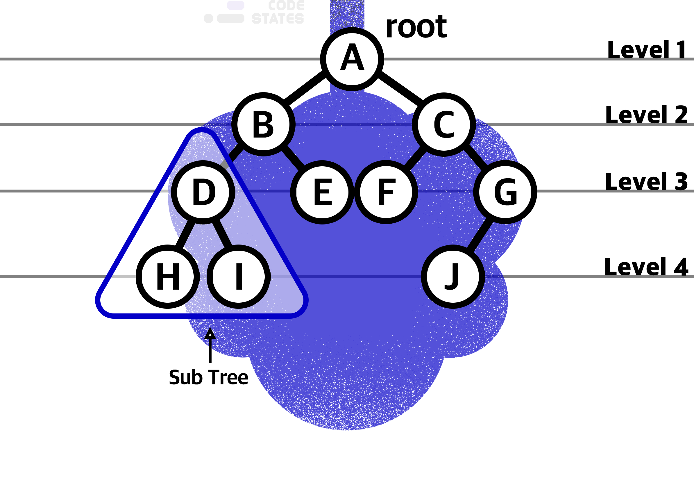 트리 구조안에 존재하는 작은 트리 구조를 뜻한다. 위 그림 상에서 D, H, I는 루트가 A인 트리 구조안에서 작은 트리 구조를 이룬다. 이를 서브 트리라 한다.