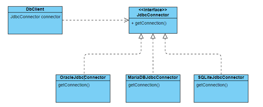 위 그림에서의 DbClient 클래스는 OracleJdbcConnector, MariaDBJdbcConnector, SQLiteJdbcConnector와 같은 구현체에 직접적으로 연결해서 얻는 것이 아닌