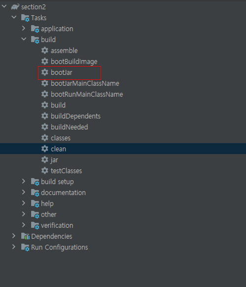 Tasks/build의 bootJar 파일을 더블 클릭하면 해당 프로젝트를 빌드하여 결과물을 얻을 수 있다.