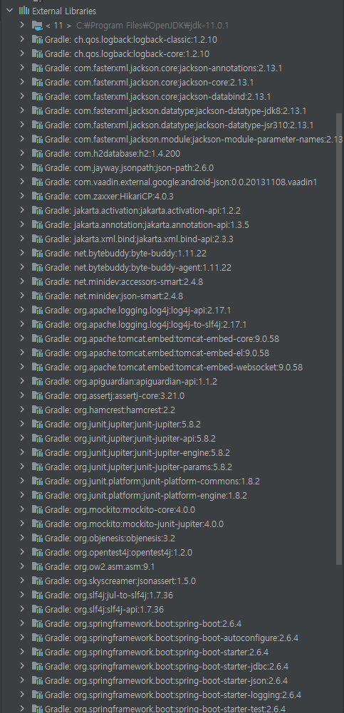 다음은 위 코드의 의존 라이브러리 설정으로 인해 실제 애플리케이션에서 의존하는 라이브러리가 포함된 이미지이다.