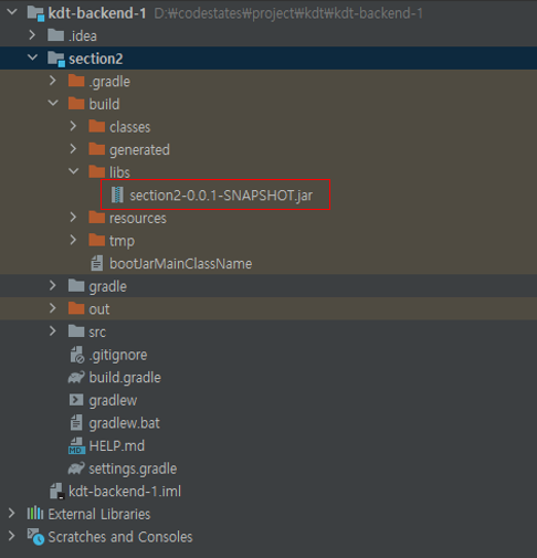 빌드 파일은 프로젝트 내의 libs 폴더 안에 저장되며 빌드의 결과물인 Jar 파일을 얻게 된다.