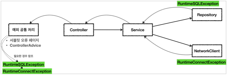 런타임 예외는 앞서 Repository와 같이 필요에 따라, 잡아서(catch) 처리가 가능하기 때문에 공통으로 처리하는 부분을 만들어서 처리할 수 있다.