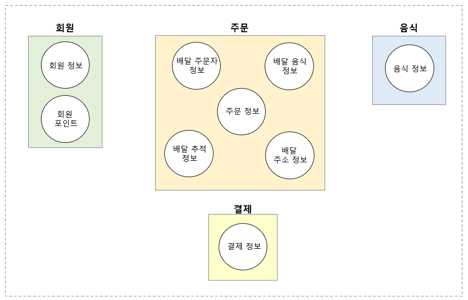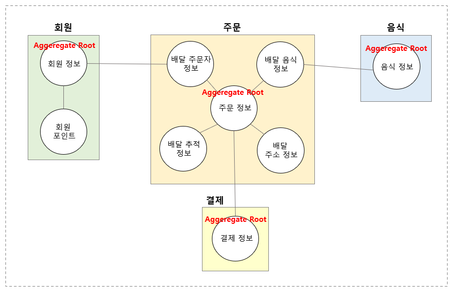 이를 회원 애그리거트, 주문 애그리거트, 음식 애그리거트, 결제 애그리거트 등으로 부를 수 있다.