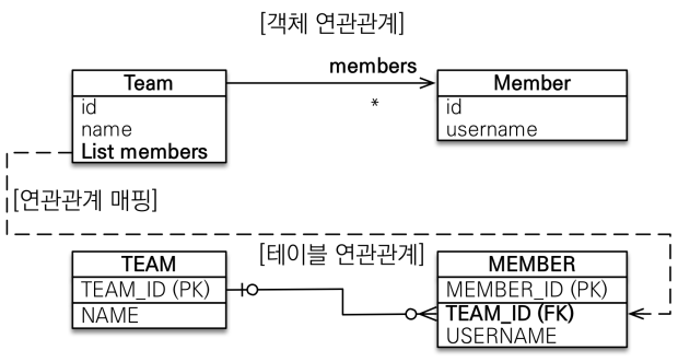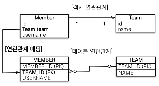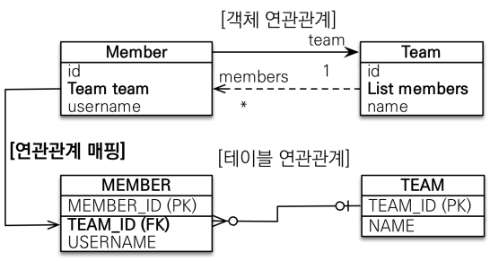- MEMBER 테이블에 TEAM_ID 외래 키가 있으므로, Member 클래스에 Team 객체를 선언