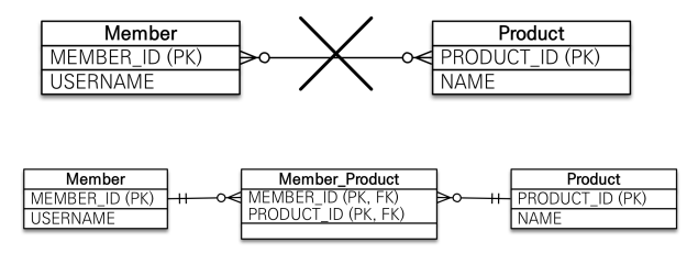 관계형 데이터베이스에서는 정규화된 테이블 2개로 다대다 관계를 표현할 수 없다.