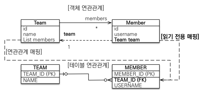 - Team에서 Member 객체를 List 형태로 갖게 된다. Member 객체를 통해 Team을 알고 싶지 않은 경우에 사용할 수 있다.