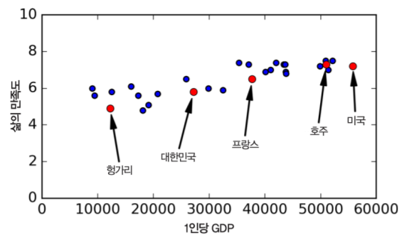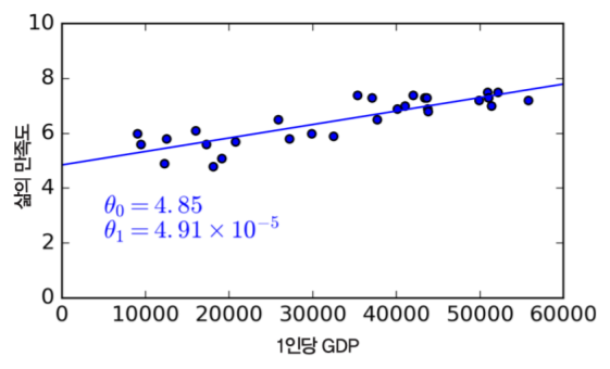 이후 새로운 데이터(임의의 국가의 GDP)를 통해 삶의 만족도를 예측하는 데 사용할 수 있게 됩니다.