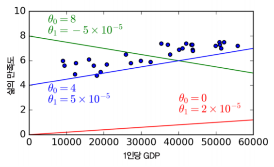 이를 분석하기 위해 데이터를 대표하는 선형 모델(직선)을 찾아야 합니다. 다음과 같은 '삶의 만족도' = θ0 + θ1 × '1인당 GDP' 계산식을 통해 선형 모델 직선을 찾고, 이후 또다시 데이터를 대표할 수 있는 선형 방정식을 찾아야 합니다.