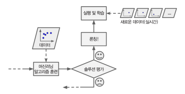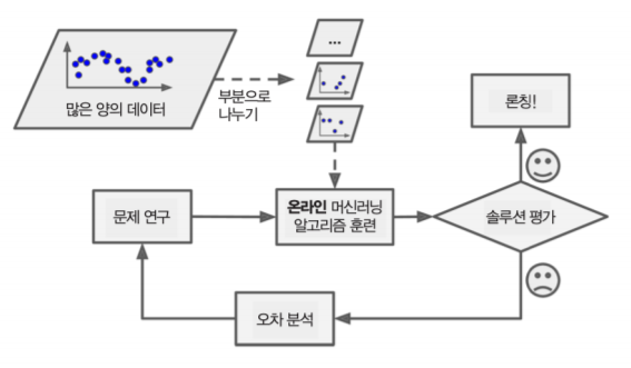 온라인 학습은 하나씩 또는 적은 양의 데이터인 미니 배치(mini-batch)를 사용하여 점진적으로 훈련을 하는 방법입니다. 미니 배치 단위로 학습을 하기 때문에 일반적인 배치 학습에 비해 적은 양의 자원을 사용합니다. 하지만 나쁜 데이터가 주입되는 경우 시스템 성능이 점진적으로 떨어질 수 있기 때문에 지속적인 시스템 모니터링이 필요합니다.