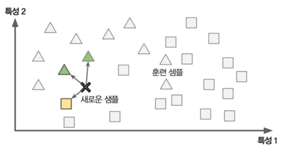 사례 기반 학습의 예로 k-최근접 이웃(k-NN: k-Nearest Neighbors) 알고리즘을 들 수 있습니다. 위 사진을 보면, 새로운 샘플인 X가 기존에 세모인 샘플, 네모인 샘플과의 유사도를 측정하여 유사도가 높은 도형으로 분류하는 것입니다. 위 사진의 경우 새로운 샘플은 세모인 샘플과의 유사도가 더 높게 측정되므로 세모로 분류됩니다.