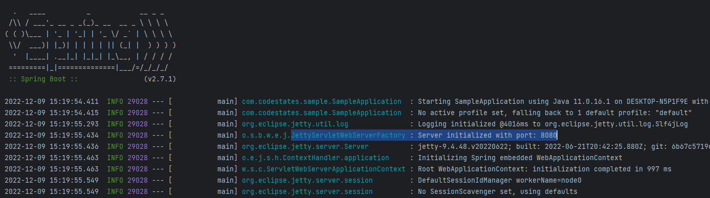 아래 이미지는 스프링 부트의 기본 내장 서버인 톰캣(Tomcat)에서 Jetty로 변경하여 실행된 모습이다.