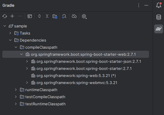 스프링 부트 프로젝트 우측의 Gradle에서 Dependencies 하위 목록을 살피면 Tomcat이 포함되어 있는 것을 확인할 수 있다.