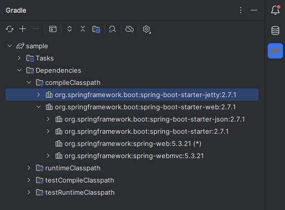 Jetty에 대한 의존성을 추가한 후 프로젝트를 리로드(reload)하여 Jetty 의존성이 추가되었는지 확인한다.