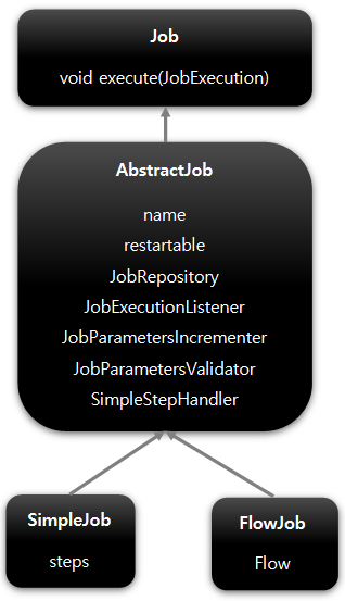 AbstractJob 추상 클래스를 상속받는 기본 구현체다. SimpleJob은 steps, FlowJob은 Flow 객체를 변수로 가지고 있다.