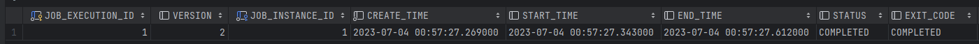 2023-07-04 00:57:27.623 INFO 30264 --- [ main] o.s.b.c.l.support.SimpleJobLauncher : Job: [SimpleJob: [name=job]] completed with the following parameters: [{name=user1}] and the following status: [COMPLETED] in 269ms