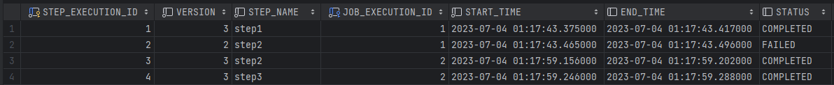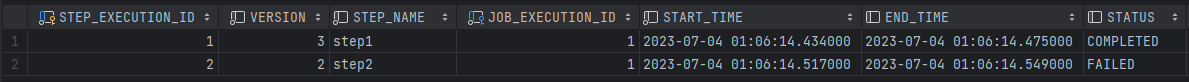 2023-07-04 01:17:59.156 INFO 25944 --- [ main] o.s.batch.core.job.SimpleStepHandler : Executing step: [step2]