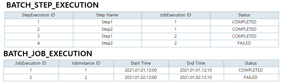 - 2021년 1월 2일에 실행된 Job은 Step2에서 FAILED하여 Job은 최종적으로 실행에 실패한다.