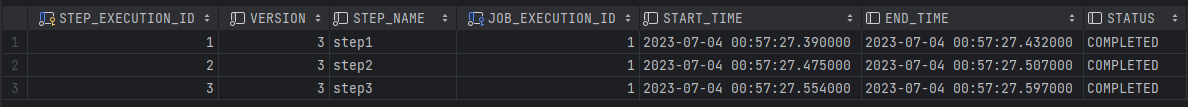 2023-07-04 00:57:27.554 INFO 30264 --- [ main] o.s.batch.core.job.SimpleStepHandler : Executing step: [step3]