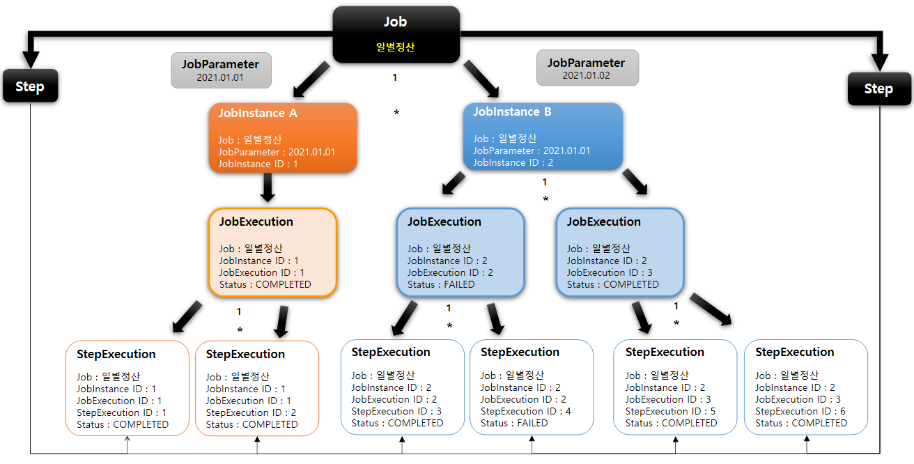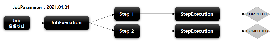 - 2021년 1월 1일에 실행된 Job은 2개의 Step을 모두 COMPLETED하여 Job은 최종적으로 실행에 성공한다.