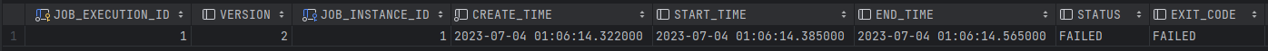 2023-07-04 01:06:14.578 INFO 19532 --- [ main] o.s.b.c.l.support.SimpleJobLauncher : Job: [SimpleJob: [name=job]] completed with the following parameters: [{name=user1}] and the following status: [FAILED] in 180ms