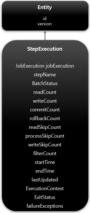 StepExecution은 Step에 대한 한 번의 시도를 의미하는 객체로 Step 실행 중에 발생한 정보들을 저장하고 있다. StepExecution에는 Step의 시작시간, 종료시간, 상태(시작, 완료, 실패 등), commit count, rollback count 등의 속성을 가지고 있다.