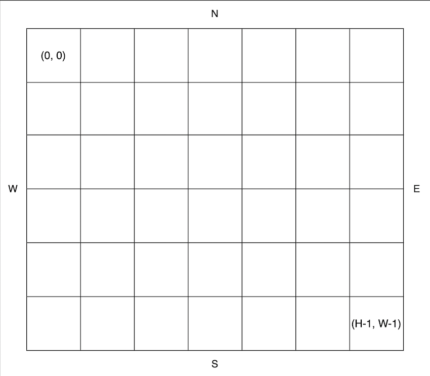 공원의 가로길이가 W, 세로 길이가 H라고 할 때, 공원의 좌측 상단의 좌표는 (0, 0), 우측 하단의 좌표는 (H - 1, W - 1)입니다.