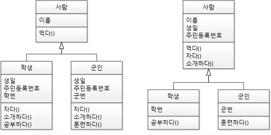 - 빈약한 상위 클래스인 경우 하위 클래스인 학생 클래스와 군인 클래스는 같은 속성과 메서드(생일, 주민등록번호, 자다(), 소개하다())를 공통적으로 가지고 있는 것을 볼 수 있다.