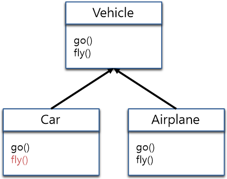 - 만약, Car 클래스와 Airplane 클래스가 Vehicle의 구현체로 구현한다면, Car는 날지 못함에도 불구하고 fly() 메서드를 구현하게 된다.