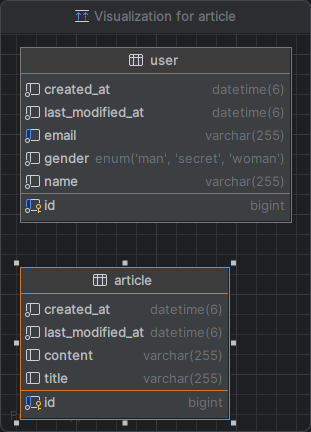 애플리케이션을 실행한 후 생성된 테이블을 살펴보면 user 테이블과 article 테이블에 created_at, last_modified_at이 생성된다.