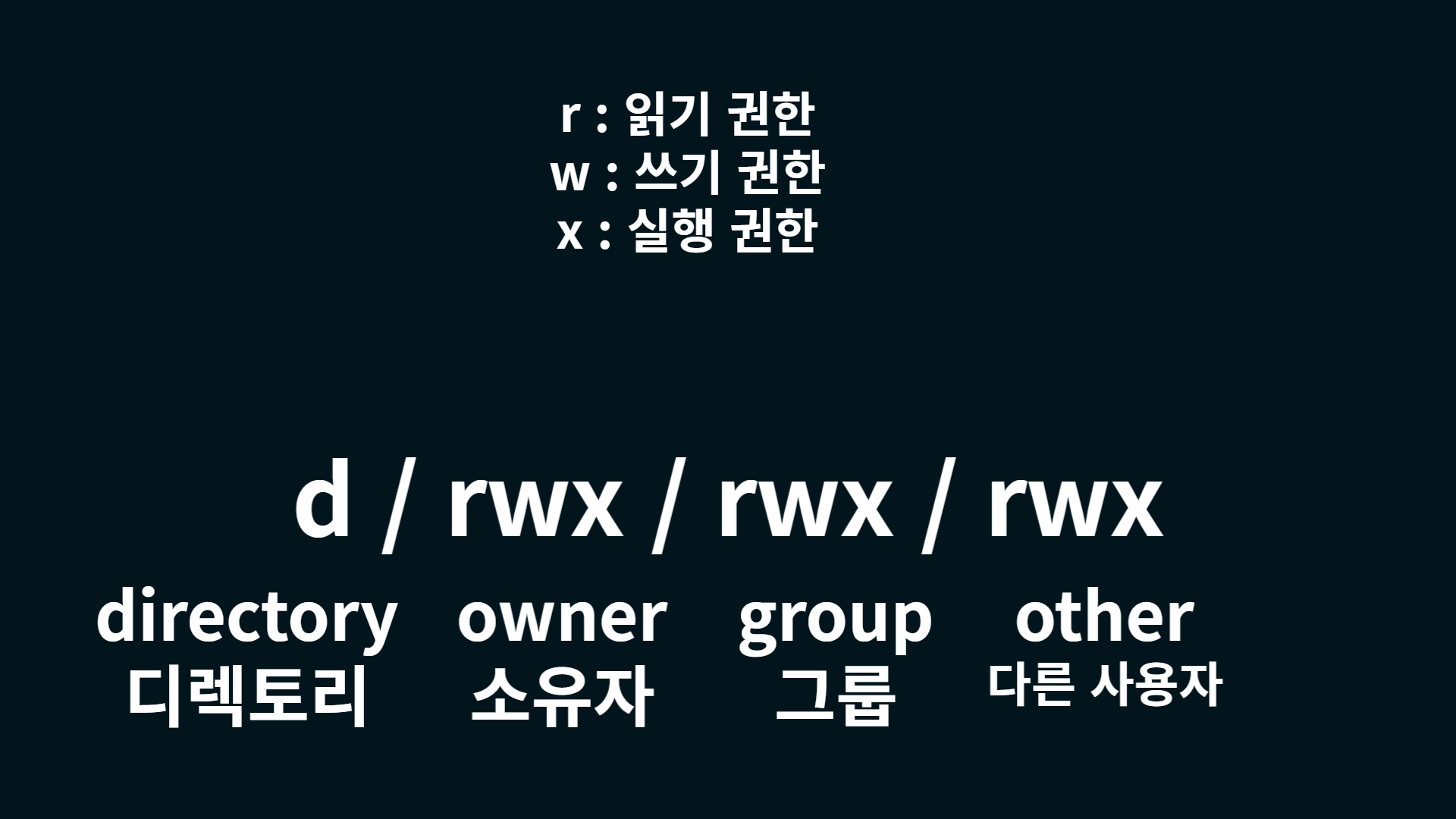 이어지는 r, w, x는 읽기 권한(read permission), 쓰기 권한(wirte permission), 실행 권한(execute permission)을 나타낸다.