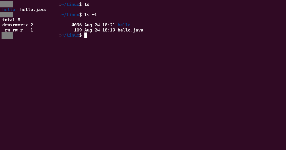 hello 디렉토리는 소유자는 읽기와 쓰기, 실행 모두 가능하고, 그룹과 나머지 사용자는 읽기와 실행만 가능하다는 의미이다.