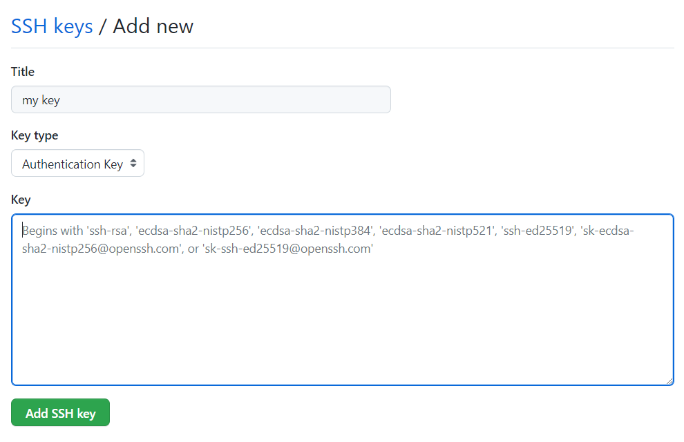 다음과 같은 창에서 Title을 임의로 지정한 뒤, Key 안에 복사한 SSH Key를 붙여 넣기 한 뒤, 좌측 하단의 Add SSH Key를 클릭하여 등록한다.